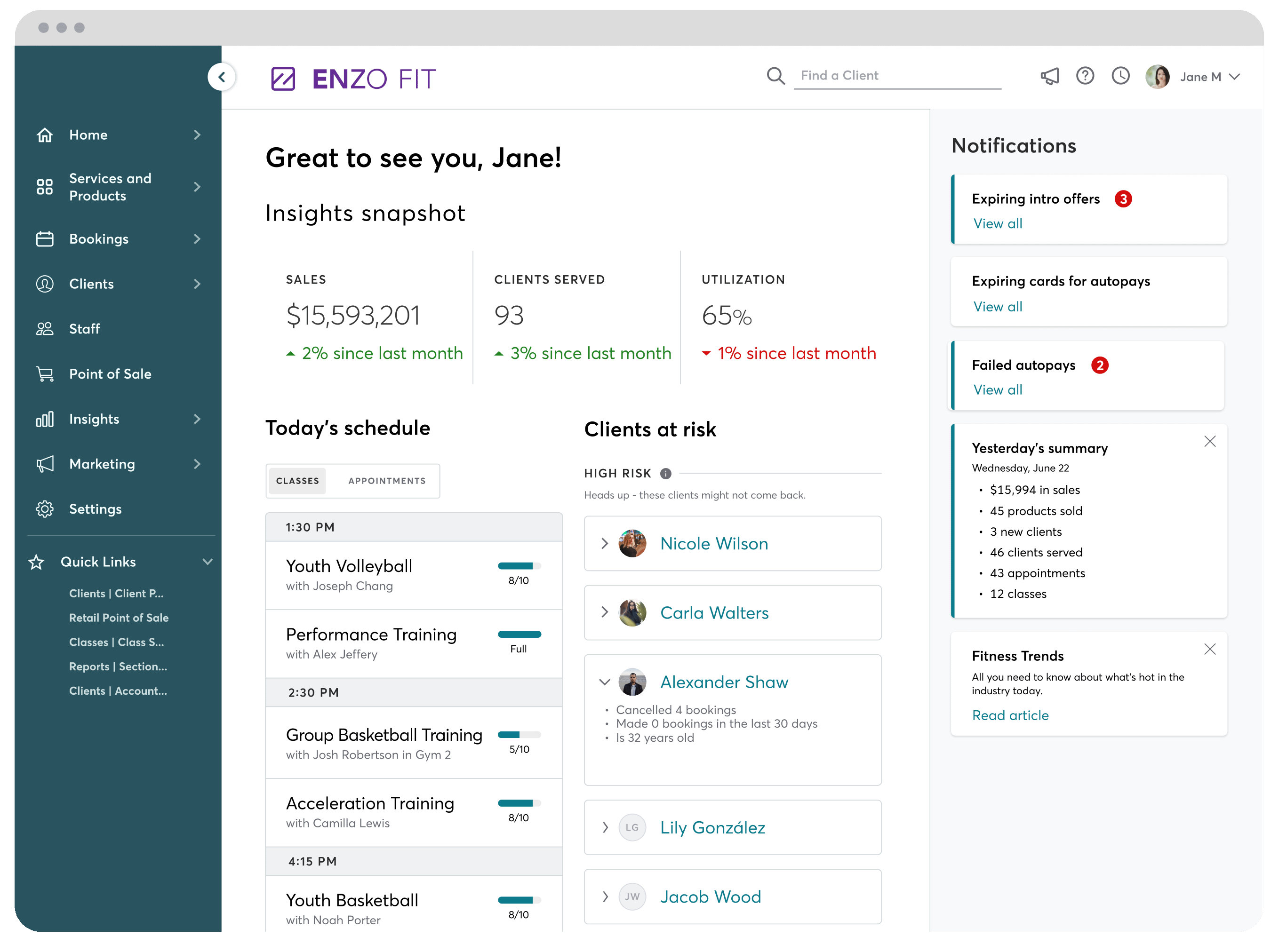- Client management, including detailed profiles, progress tracking, and performance treatment information for a personalized touch